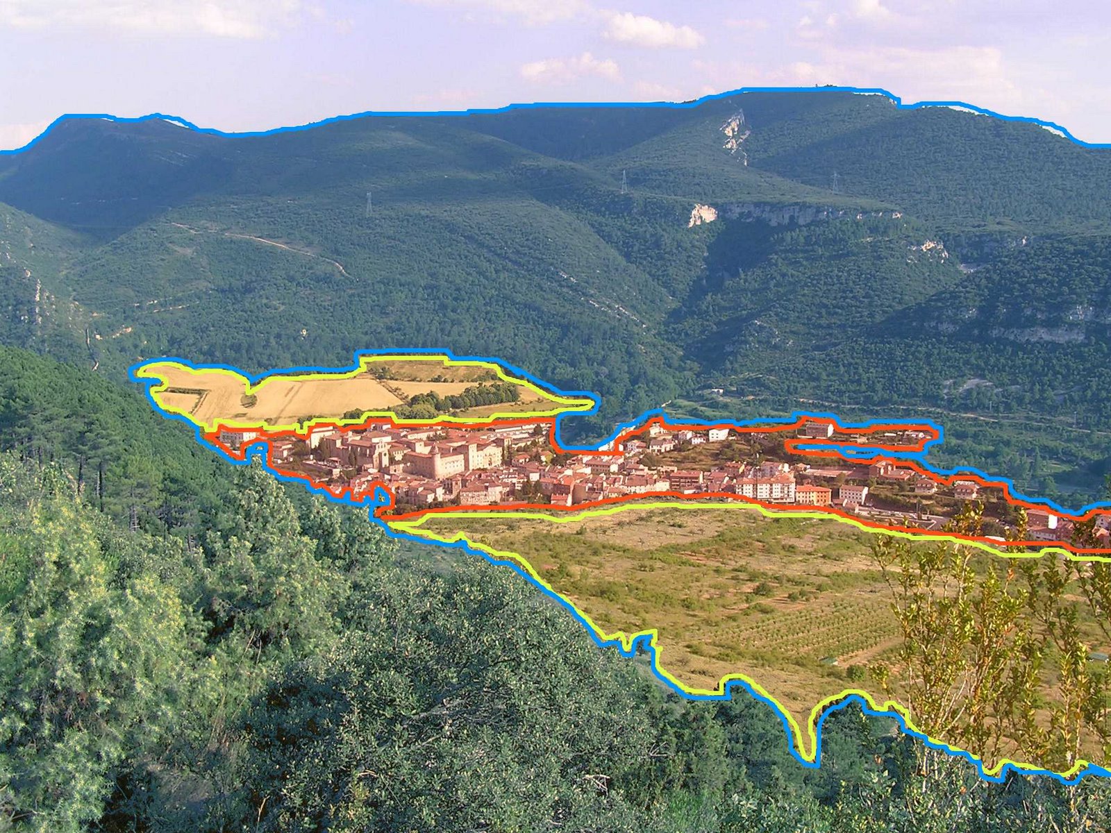 En esta imagen vemos un valle entre montañas en el que se ubica un núcleo de población.(1- presentación y caracterización general del paisaje mostrado)  En él se distinguen claramente dos áreas bien definidas: las laderas y cumbres de las montañas, por un lado, y el fondo del valle, más o menos plano, por otro.  A su vez, dentro de esta última, el espacio se reparte entre el núcleo de poblamiento y lo que parecen campos de cultivo. (2- Análisis visual del paisaje, especificando los elementos o partes en los que éste se divide)