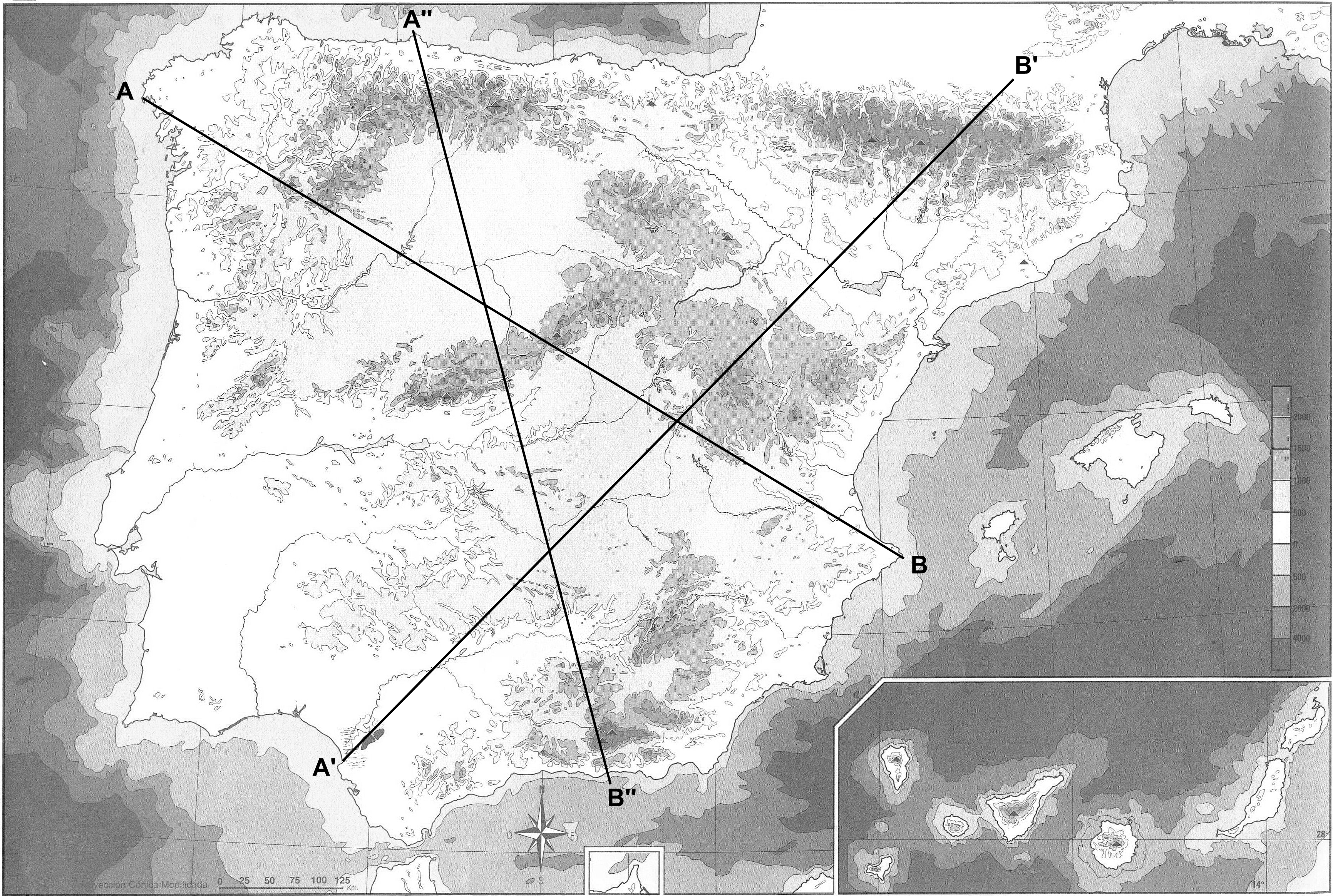 Utiliza un mapa topográfico de la Península Ibérica, como el de la imagen, para realizar los tres cortes topográficos que se proponen en él: