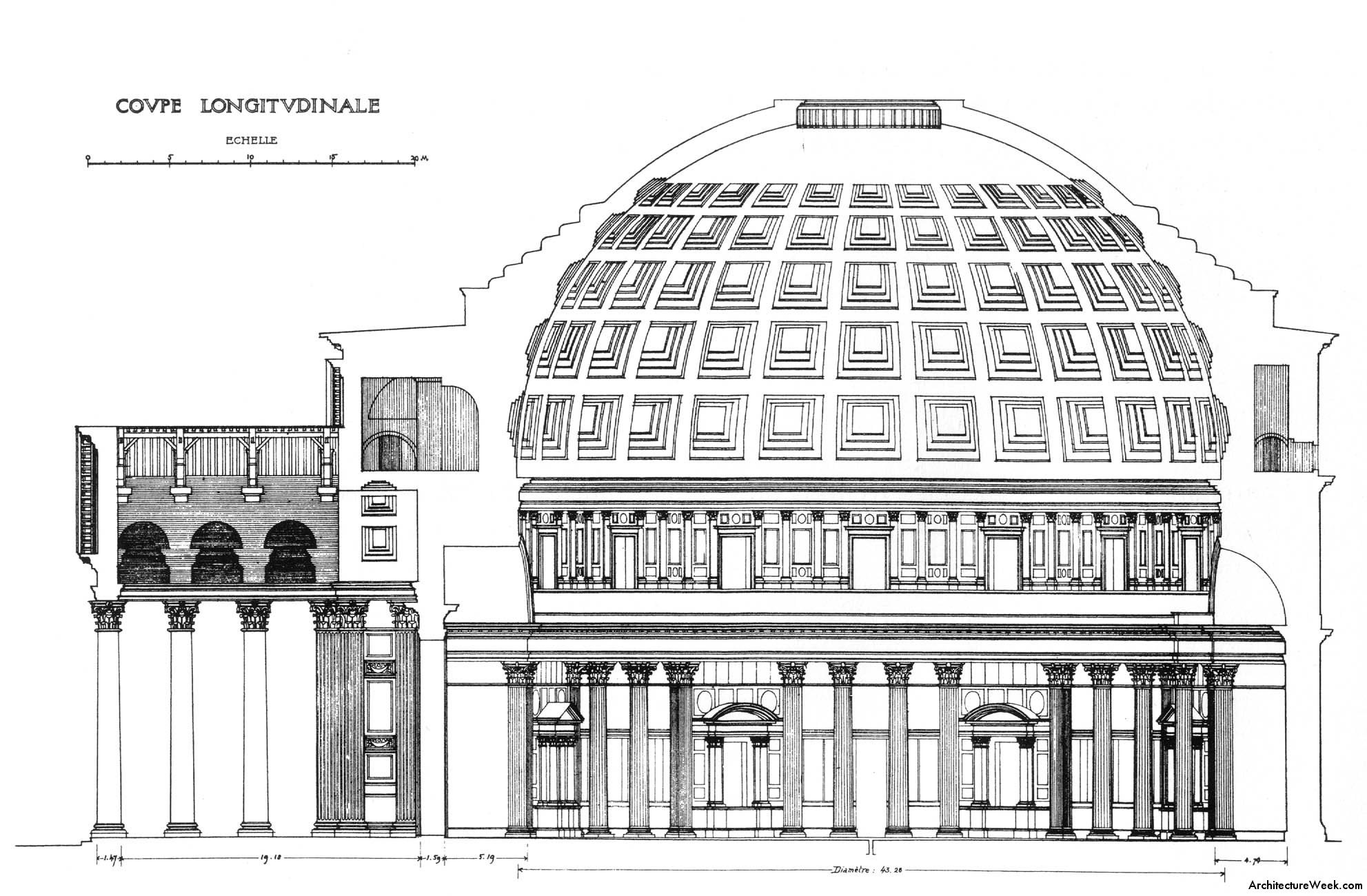Presenta una estructura circular en la naos o cella , que está cubierta por una cúpula semiesférica hecha de hormigón de masa (la más grande de la historia), y un pórtico de columnas corintias con frontón triangular sin relieves, que se divide en tres naves. El muro exterior es muy grueso y en el están insertados ocho grandes machones o pilares que constituyen los principales soportes de la cúpula.