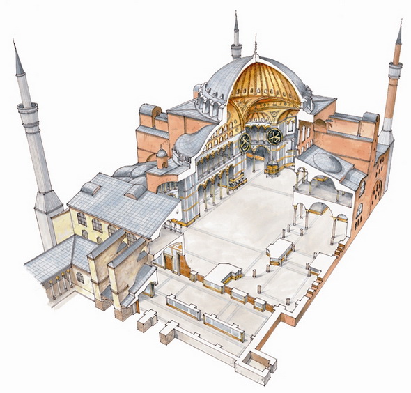 La basílica más grande y representativa de la arquitectura bizantina es Santa Sofía, en Constantinopla. Mandada construir por Justiniano, cuenta con una enorme cúpula sobre pechinas sobre el centro de la nave principal, cuyos empujes son contrarrestados por cúpulas secundarias que permiten mantener el equilibrio estructural del conjunto. Las naves laterales se cubren con bóveda de cañón y sobre ellas se dispone una tribuna. Así pues, su planta es un compromiso entre el tipo basilical y la planta central y servirá de modelo en el futuro para otros templos cristianos e, incluso, musulmanes.