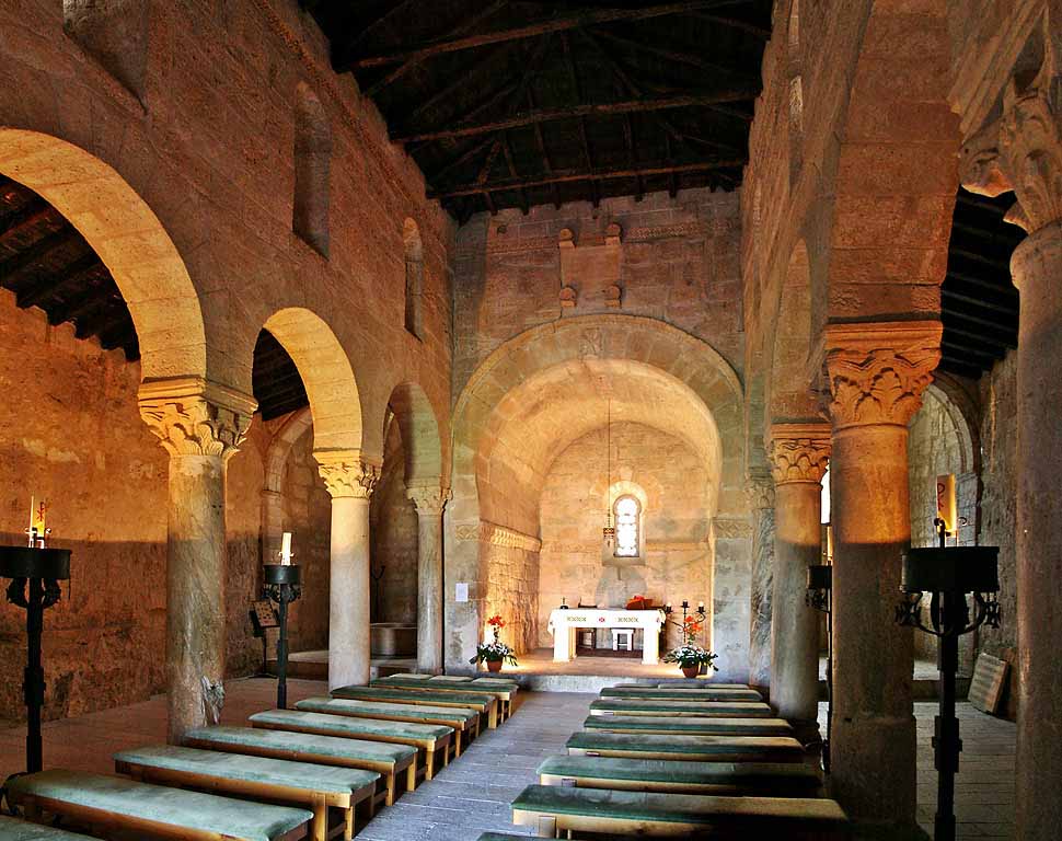 En el alzado de la basílica destacan las columnas y arcos que separan las naves laterales de la central y la mayor altura de ésta, que permite abrir los ventanales por los que entra la luz al interior del edificio. La cubierta es plana, de madera, y con tejado a dos aguas sobre la nave central y a una sobre las laterales. La abertura del ábside en la pared del fondo es realzada por un arco triunfal que culmina la nave central y es de su misma anchura.