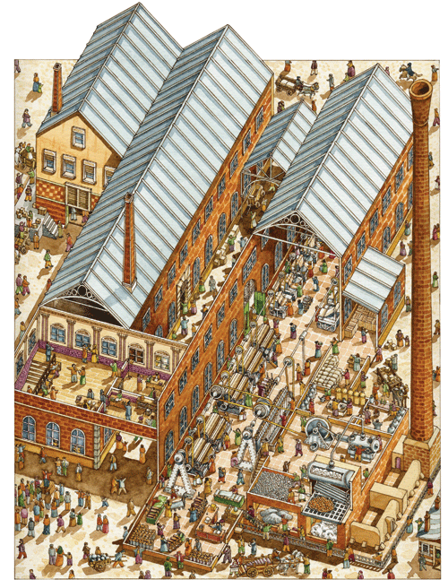 Fue en las ciudades inglesas, en el último cuarto del siglo XVIII, donde surgieron las primeras fábricas, al generalizarse el llamado sistema fabril de producción industrial. Este nuevo sistema dividía y racionalizaba el proceso productivo, lo que, unido a la incorporación de máquinas cada vez más eficientes, permitía dar respuesta al aumento de la demanda provocado por la creciente población urbana.