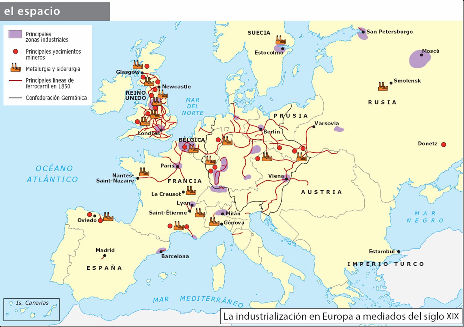 Al acabar el primer cuarto del siglo XIX, la Revolución industrial estaba en marcha. No sólo en Inglaterra, donde se había consolidado ya, sino también expandiéndose por el continente: Bélgica y el norte de Francia comenzaron a industrializarse desde principios del siglo, y Alemania, Suecia y el norte de Italia estarían en pleno desarrollo industrial antes de finalizar la primera mitad del siglo.