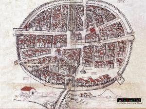 - Radiocéntrico, en el que la disposición de los espacios construidos y las calles se ordena a partir de un núcleo central. De él parten, como radios, las principales vías de la ciudad, que son cortadas por otras que forman anillos en torno al centro.