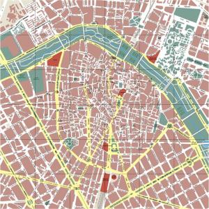 En el plano queda visible, no solo la morfología general urbana, sino también las partes que constituyen la ciudad, cada una con unas funciones, una historia y una morfología diferenciadas, perfectamente reconocibles en él, como se aprecia en el último de los planos.