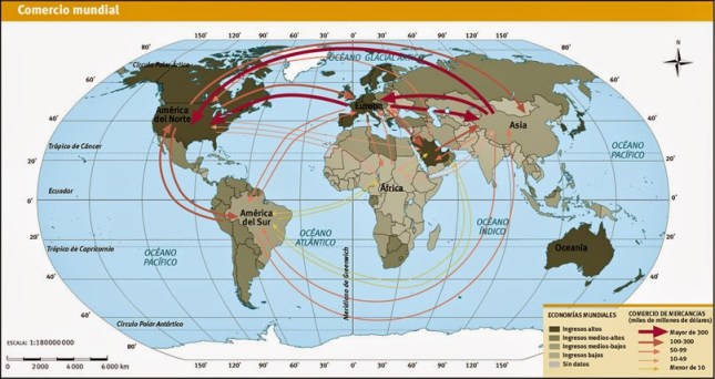 Como se puede observar en el mapa, los flujos comerciales más intensos son los que tienen como origen o destino los países más desarrollados, con mayores ingresos.