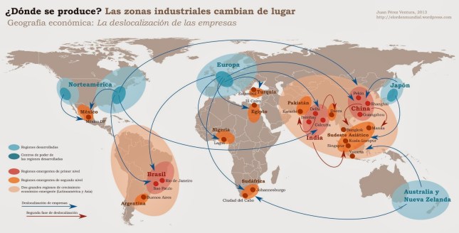 Así pues, la deslocalización ocurrida en los países industrializados tradicionales (EE.UU., Europa Occidental y Japón) ha tenido como destino y ha promovido la creación de grandes regiones industriales en China Oriental, el Sureste Asiático (Indonesia, Malasia, Vietnam, Filipinas, etc.), el subcontinente Indio (Pakistán, Bangladés y la India) Brasil y otros países de Suramérica (Colombia, Perú, Ecuador, etc.), tal como podemos observar en el mapa.