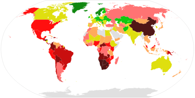 Sin embargo, este índice no sirve para medir las desigualdades internas de cada país, que son tan reales y recalcitrantes como las que existen entre países. Para ello contamos, no obstante, con otro indicador bastante fiable, como es el índice de Gini, que mide la distribución de la renta dentro de cada estado. Los valores de cada país nos permiten representarlos en un mapa como el que se muestra debajo, en el que los países más equilibrados aparecen en tonos verdes o verdeamarillentos y los más desiguales en tonos rojizos oscuros, o en el gráfico que se muestra a continuación:
